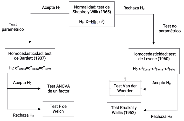 Si la desnutrición infantil es una variable con distribución aproximadamente normal, se emplea el enfoque paramétrico con las pruebas del análisis de la varianza (ANOVA) o F de Welch, según el cumplimiento de la homocedasticidad, es decir que la variabilidad observada en la desnutrición infantil sea constante para todas las regiones naturales. En el opuesto, los test no paramétricos tienen por hipótesis nula la igualdad de medianas (M), por ejemplo M=20.50% indica que la mitad de los departamentos en cada región registra una prevalencia de desnutrición infantil igual o por debajo del 20.50%, nuevamente el supuesto de homocedasticidad determina el uso del test Van der Waerden o Kruskal y Wallis (ver figura 2).