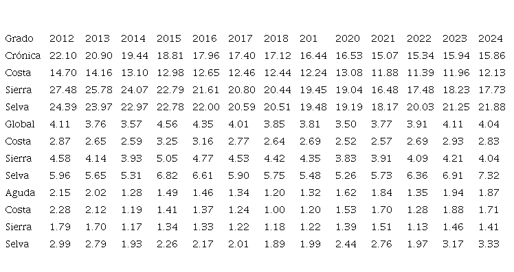 Tabla 1. Perú: evolución de la desnutrición infantil 2012-2024, según grados y región natural