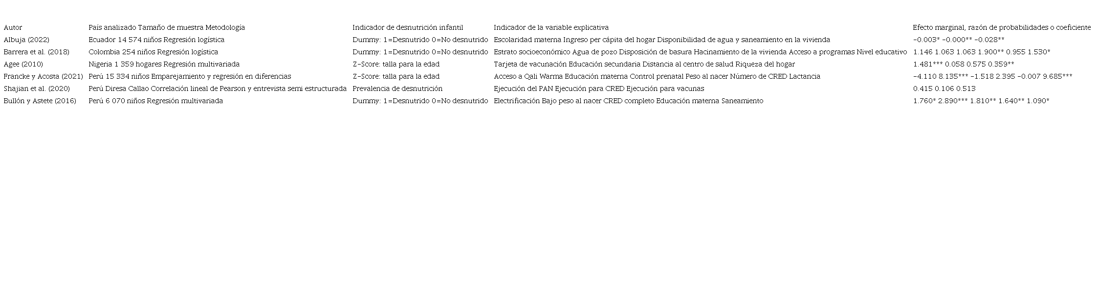 La tabla 3 resume una serie de estudios transversales sobre desnutrición, los cuales al usar datos de un momento específico no capturan la variabilidad inobservable, es decir los factores del niño y su entorno que se asocian con el estado nutricional pero varían en tiempo y espacio. Si bien la evidencia es clara al señalar que la probabilidad de ser desnutrido es mayor en el área rural, no aborda aspectos geográficos más allá de la altitud como es el caso de Albuja (2022). Los modelos de elección discreta para un mejor ajuste requieren una muestra bastante significativa (>500), en este sentido, la estimación de Barrera et al. (2018) presenta limitantes. Para el caso peruano, el trabajo de Bullón y Astete (2016) analiza los determinantes de la desnutrición según el dominio geográfico, pero no evidencia si vivir en alguno de estos espacios favorece la probabilidad de ser diagnosticado con desnutrición.