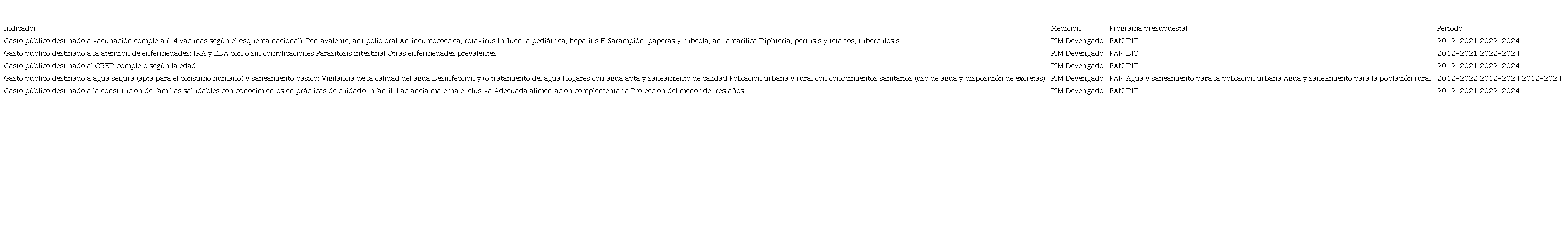 Los datos del gasto público provienen del Ministerio de Economía y Finanzas (MEF) a través de la consulta amigable de ejecución, con información desde el año 1999. Dado que las dimensiones consideradas surgen de los programas presupuestales, específicamente el Programa Articulado Nutricional (PAN), agua y saneamiento para la población tanto urbana como rural y el desarrollo infantil temprano (DIT), se ajusta el periodo a 2012-2024 como refleja la tabla 4.