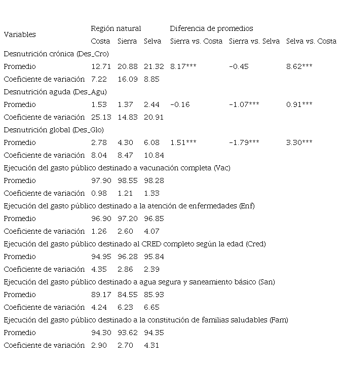 Media y coeficiente de variación se usan para el análisis descriptivo. Para comprobar la primera hipótesis de que la desnutrición infantil difiere por región natural, independientemente del grado, se aplica el test de comparación de medias para muestras no pareadas.
