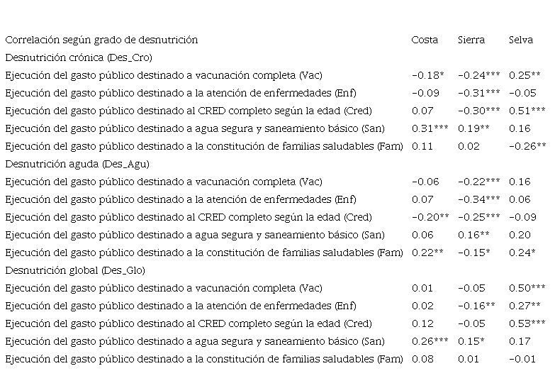 Entre la desnutrición infantil y la ejecución del gasto público existe una asociación negativa y significativa solo para algunas actividades y regiones naturales. Vacunación completa registra una correlación débil para los grados crónico y agudo de desnutrición en costa y sierra; atención de enfermedades tiene una correlación entre débil y moderada en todos los grados; por su parte la asociación con el control de crecimiento y desarrollo completo es significativa para desnutrición global y en la sierra. Además, la ejecución del gasto público destinado a la constitución de familias saludables se asocia en forma negativa tanto en sierra como selva. La tabla 7 evidencia que solo para la ejecución de agua segura y saneamiento la asociación es positiva.