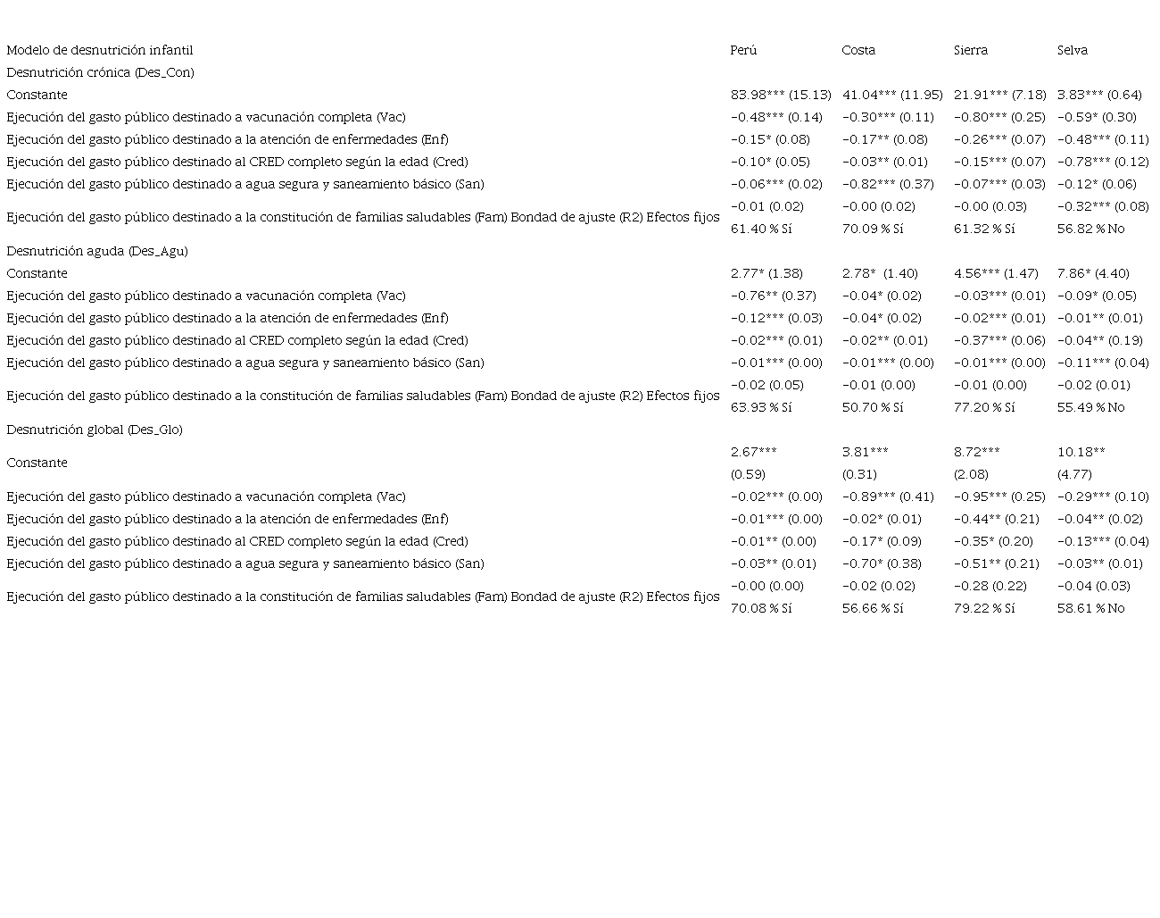 Se especifica un modelo que incorpora indicadores de tres dimensiones del gasto público: estado de salud del niño, entorno físico de la vivienda y entorno seguro del hogar. Usando errores estándar corregidos para panel y el estimador de Prais-Winsten (1954), se encuentra que sobre la desnutrición infantil influyen negativa y significativamente, la ejecución del gasto público destinado a la vacunación completa, la atención de enfermedades y el control de crecimiento y desarrollo completo; la mayor influencia se registra para la desnutrición aguda de la costa y selva lo que promueve mejoras en el estado de salud del niño. La ejecución destinada al entorno físico de la vivienda también influye en la desnutrición crónica y aguda, a través del gasto público para agua segura y saneamiento básico. En tanto, la ejecución del gasto público destinado al entorno seguro del hogar es significativa solo para la desnutrición crónica de la región selva, a través de la constitución de familias saludables.