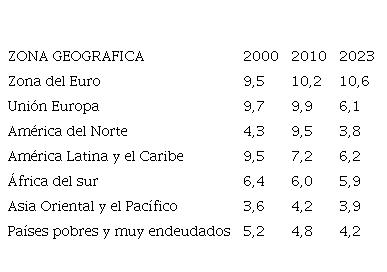 Se puede apreciar que, en la zona del euro, el desempleo ha tenido una incidencia al alza, pasando de una tasa del 9,5% en el primer año a 10,6% en 2023. En cambio, en la Unión Europea el escenario se torna diferente, observándose que para 2023 se refleja una caída significativa al 6,1% luego de que en los años anteriores se ubicó cercano al 10%. El escenario en América del norte es diferente en el 2010 el desempleo aumentó notablemente, debido a la crisis financiera global; y para el 2023 la recuperación ha sido bastante representativa al llegar al 3,8%, constituyéndose al mismo tiempo en la zona con la menor tasa del desempleo.