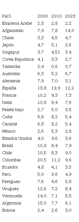 Con respecto a América Latina y el Caribe, el caso fue diferente, la tendencia del desempleo fue a la baja, pasando del 9,5% en el 2000 al 7,2% para el 2010, y finalmente en el 2023 bajó al 6,2%. Por su parte como región en África del Sur la tasa del desempleo no es muy elevadas, partiendo con una tasa del 6,4% para el año 2010, con una leve tendencia a la baja, alcanzando una tasa del 5,9% en el año 2023, las regiones asiáticas y el Pacífico el escenario es diferente, es donde se sitúan las tasas más bajas de desempleo, en donde el 2000 alcanzo el 3,6%, para el 2010 aumento al 4,2% recuperándose en el 2023, con el 3,9%. Para la región que comprende los países más pobres el escenario es diferente, la tasa del desempleo no es muy altas y podemos apreciar en la tabla que su tendencia a la baja es relativamente moderada, pasando del 5,2% en el 2010 al 4,2% en el 2023.