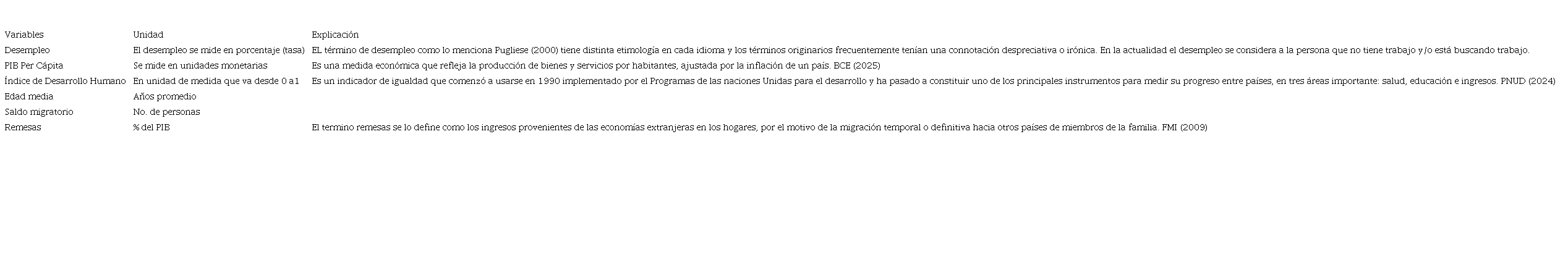 Para realizar la aplicación econométrica se ha utilizado datos de variables en series de tiempo para el periodo 1991–2023 con frecuencia anual, con un total de 33 datos que permite cumplir con lo estipulado en la metodología que recomienda la utilización de un número no menor de 30 observaciones. Los datos fueron obtenidos de registros oficiales alojados en la página web del Banco Central del Ecuador (2024), informes proporcionados por el Instituto Ecuatoriano de Estadística y Censos (INEC) y la base de datos en línea del Banco Mundial (2025). Las variables de los modelos aplicados, que se evaluaron y resultaron ser estadísticamente significativas se registran en la Tabla 3.