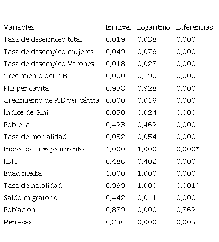 Los resultados, que se muestran en la Tabla 3, permiten observar que en datos de nivel, no todas las variables son estacionarias y las que cumplen con el parámetro determinado de la prueba son las siguientes: tasa de desempleo total, desempleo mujeres, desempleo varones, crecimiento del PIB, crecimiento del PIB per cápita, índice de Gini, tasa de mortalidad.