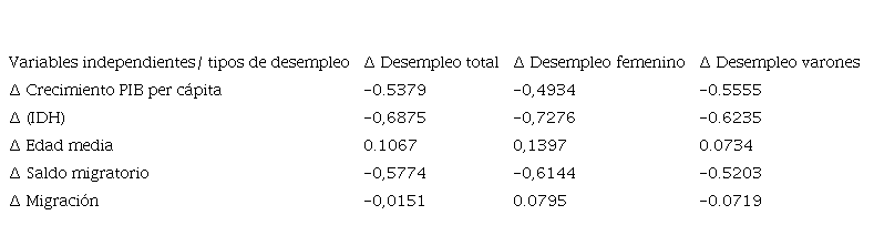 ∆ Desempleo = ∆ crecimiento PIBpc + ∆ IDH + ∆ edad media + ∆ saldo migratorio + ∆ remesas