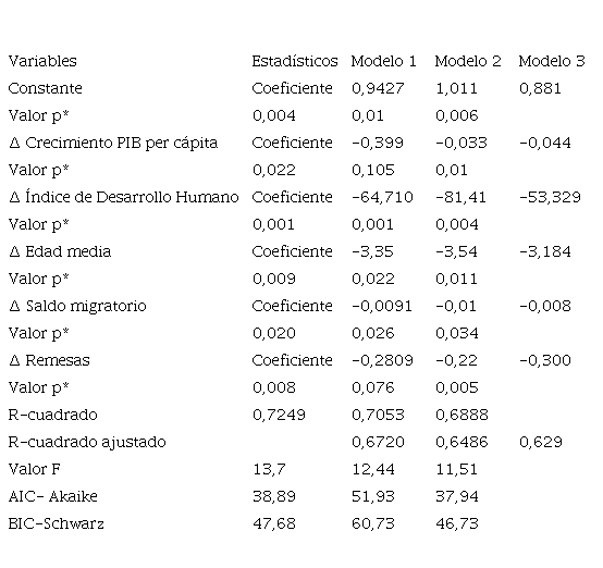Por otra parte, en los tres modelos aplicado usando una regresión lineal múltiple se procedió a realizar un diagnóstico y prueba de modelos en cada una de las variables y se determinó, que de todos los indicadores y/o variables, no todas tenían significancia estadística, por lo que se procedió a realizar el estudio con, el IDH, PIB Per-Cápita, Edad Media, Saldo Migratorio y remesas.