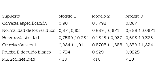 La fase tres de la estrategia econométrica consistió en la validación de los modelos estimados que contempló la realización de las pruebas de correcta especificación para lo que se usó el Test Reset Ramsey; normalidad de los residuos mediante el contraste de Jarque Bera y Philips-Perron; heterocedasticidad con el test de White y Breusch-Pagan; otra prueba fue la de multicolinealidad contratando el resultado del Factor de Inflación de la Varianza (VIF); finalmente se probó la no existencia de correlación serial con el contraste de Breusch-Godfrey y el estadístico de Durbin Watson.