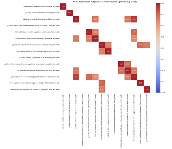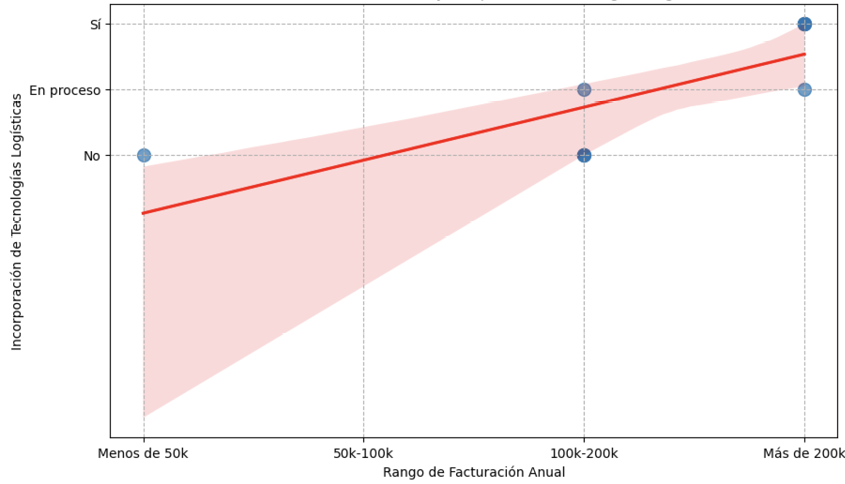 El proceso diagnóstico integrado, respaldado por el heatmap de correlaciones (figura 1), identificó asociaciones estadísticamente significativas (p < 0.05), que delinean dinámicas críticas del sector. Destacó particularmente la relación entre facturación anual y adopción de tecnologías logísticas (figura 2) (ρ = 0.897), donde el 75 % de las empresas con ingresos superiores a 100 000 USD habían incorporado herramientas de gestión de eventos.
