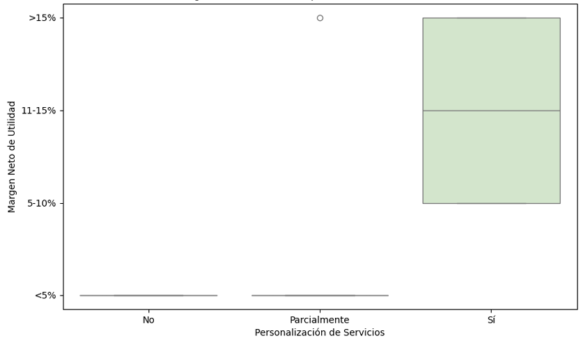 Paralelamente, se observó que el 33.3 % de las empresas que ofrecen servicios personalizados reportaron márgenes de utilidad superiores al 15 % (figura 3), confirmando una correlación positiva (ρ = 0.743) entre diferenciación de servicios y rentabilidad.