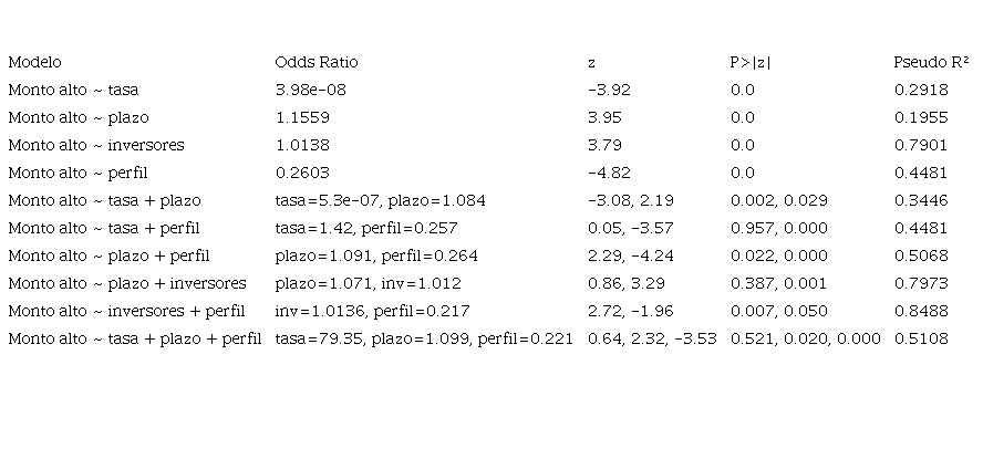 En cuanto al análisis de las variables influyentes en la probabilidad de obtener un monto alto de préstamo, la única variable con alta significancia es el número de inversores, la cual presenta un odds ratio de 1.01293. Esto indica que la probabilidad de obtener montos altos de fondeo en las plataformas de fondeo colectivo aumenta en un 1.29 % por cada inversor adicional, y este efecto es estadísticamente significativo (p = 0.016).