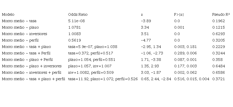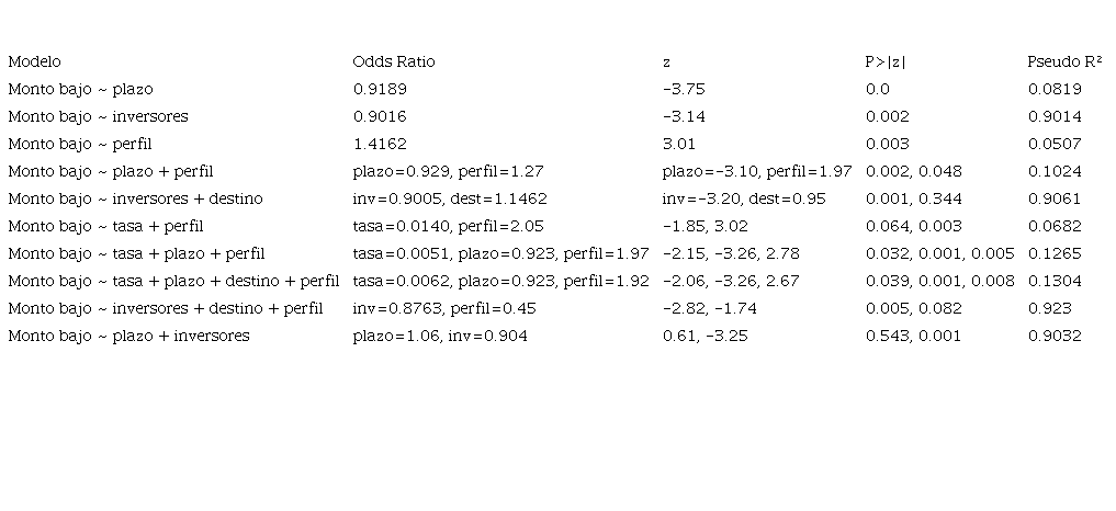 El modelo de regresión logística revela que el número de inversionistas es el factor más significativo para alcanzar montos altos de financiamiento, con un efecto positivo y estadísticamente significativo. El perfil de riesgo muestra una relación inversa con el monto fondeado, aunque su significancia estadística varía según el nivel de financiamiento. En general, las variables de plazo y destino del préstamo no presentan significancia robusta. Se recomienda incluir tablas y gráficas que sinteticen estos hallazgos para fortalecer la comprensión visual de los resultados.
