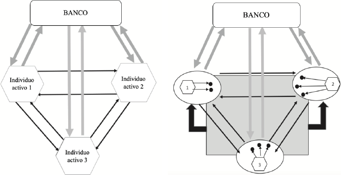 La primera figura muestra los individuos activos (representados por hexágonos) que tienen relaciones directas con el Banco. Estos individuos tienen relaciones de pago que significan que su actividad económica está orientada al mercado. Ellos tienen la misma condición y tienen relaciones de mercado (equivalencia). La segunda figura permite considerar, además, a los individuos no activos (representados por los puntos negros). Sólo acceden a los medios de pago a través de los individuos activos que los asocian con su propia actividad comercial dentro de sus empresas (óvalos). Unos se convierten en empresarios, otros en asalariados. Su relación (representada por flechas dentro de las empresas) es una relación salarial. Esta relación es jerárquica, no de mercado. No es una relación de equivalencia.