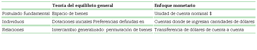 El desarrollo de un discurso teórico coherente sobre esta base se apoya en un conjunto de postulados, para los cuales es interesante establecer una comparación con los de la teoría del equilibrio general competitivo. Esto es lo que se hace en el Cuadro 1.