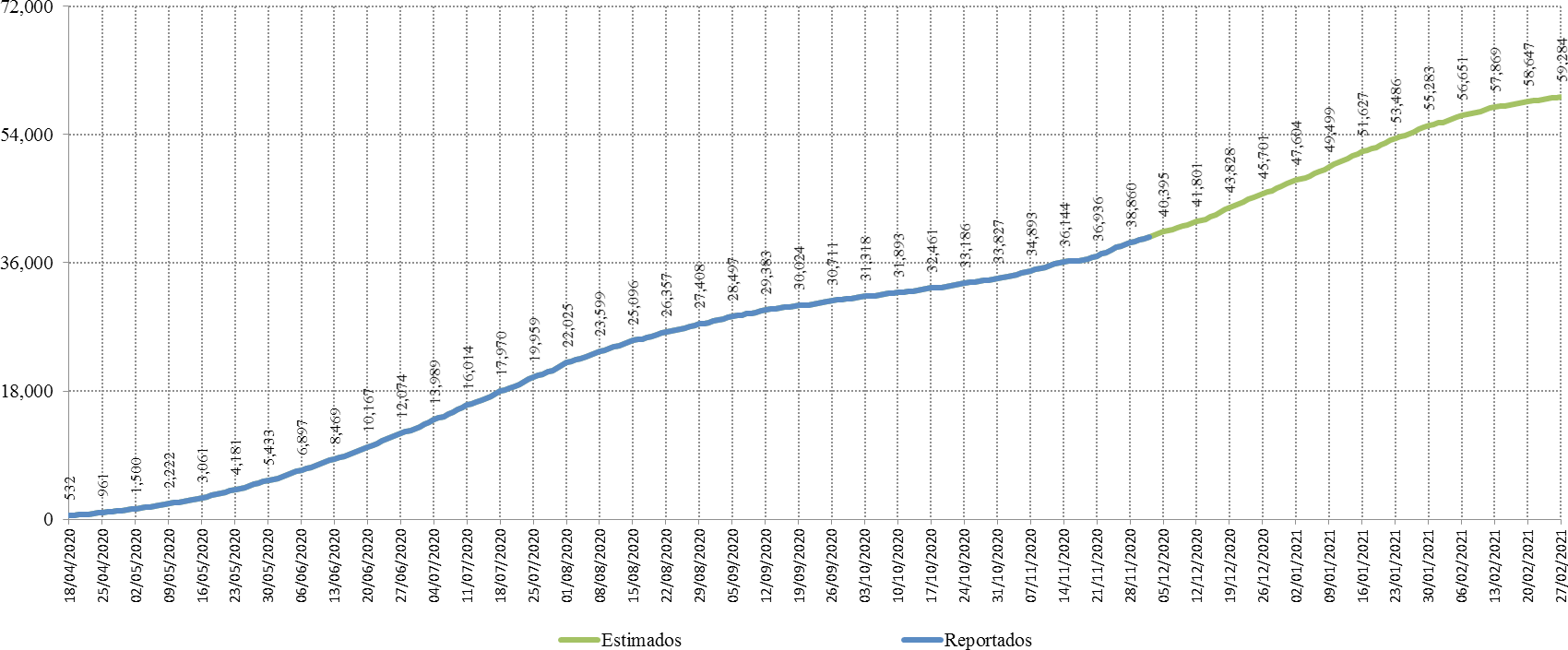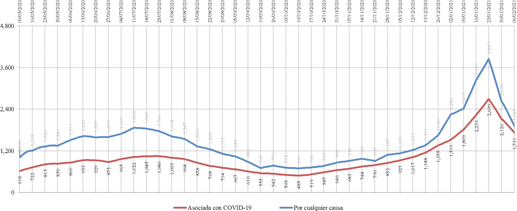 Este procedimiento permite conocer que al cierre del año epidemiológico 2020 se habían contabilizado casi 310 mil muertes en exceso respecto a lo ocurrido en el quinquenio previo, de los que 211 mil habrían podido ser asociados directamente con la COVID-19 (gráfico 16), con una cantidad de casos semanales (gráfico 17) que generan una curva muy semejante a la curva epidémica observada a partir de los casos confirmados por prueba de laboratorio para decesos con COVID-19 (comparar con el gráfico 7).