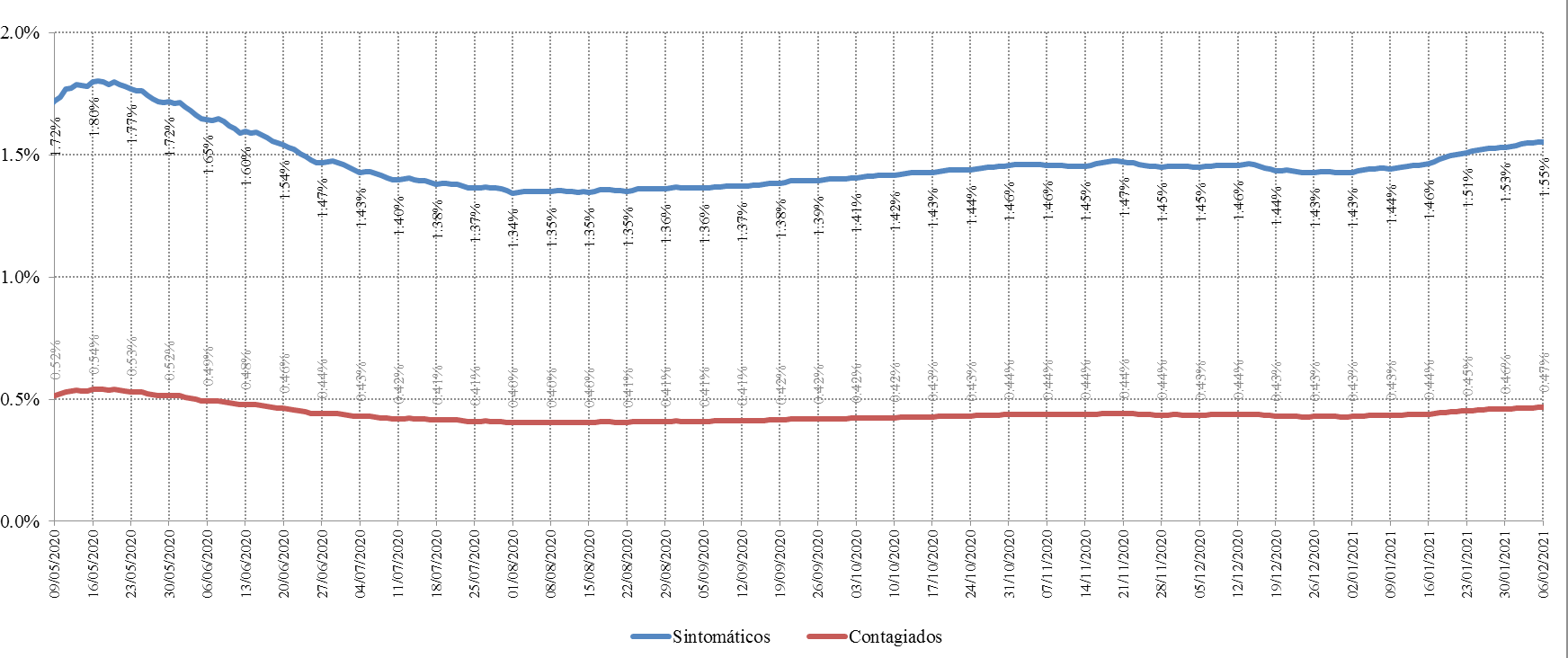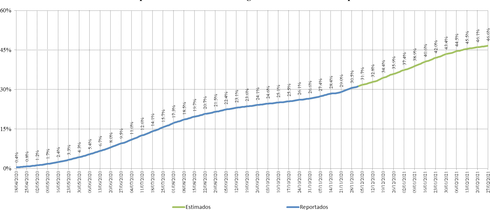 Un cálculo que permita reconstruir la curva de contagios totales y que parta de la proporción de seropositividad estimada por la ENSALUD 2020, debiera considerar una relación tendencialmente descendente entre los casos reporta- dos en el SISVER y el volumen de contagios en la población, reproduciendo el padrón que reflejaron los reportes del modelo centinela en su oportunidad. Así, al reconstruirse los datos de diversas fuentes puede ajustarse la estimación de manera tal que se logre una coincidencia entre la estimación de casos sintomáticos de contagio con SARS-CoV-2 con el volumen estimado de casos que han sido asistidos médicamente derivados de la proyección de los datos del modelo centinela, lo que otorga verosimilitud a los cálculos de esta curva.