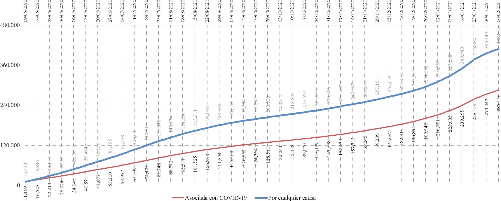 Y eso es precisamente lo que hicieron las autoridades: llevar a cabo el cómputo del exceso de mortalidad por todas las causas durante la pandemia de CO- VID-19 en México, sumando esfuerzos entre la Secretaría de Salud, cuyo SISVER permitió conocer la cantidad de defunciones confirmadas con SARS-CoV-2, el INEGI que aportó datos para calcular el canal endémico con las defunciones por semana epidemiológica de ocurrencia y entidad federativa de registro para el período 2015-2019 y del exceso de mortalidad estimado con las actas de defunción por semana epidemiológica de ocurrencia y entidad federativa de registro en 2020, a cargo del Registro Nacional de Población (Secretaría de Salud, 2021), que también permite diferenciar los decesos según pueden ser o no asociados con la COVID-19 a partir de las causas reportadas en las propias actas.