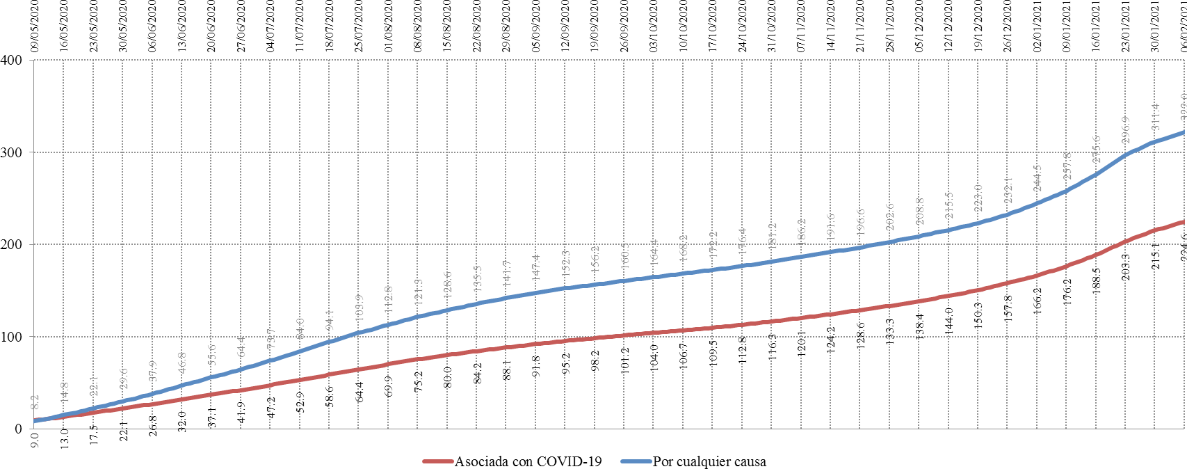 Estos datos permiten por demás establecer una mortalidad al cierre del año epidemiológico 2020 de 245 personas por cada cien mil habitantes, 166 de las cuales corresponden a fallecimientos asociados con la COVID-19 (gráfico 18), proporciones en ambos casos muy superiores a los 126 decesos por cien mil habitantes que arrojarían las cifras del cómputo cotidiano de casos registrados en el SISVER.