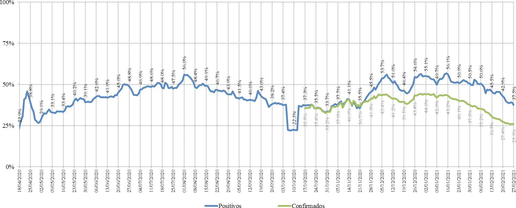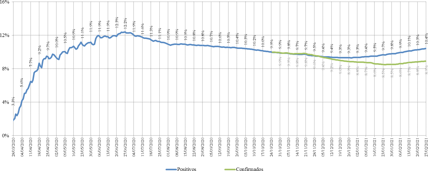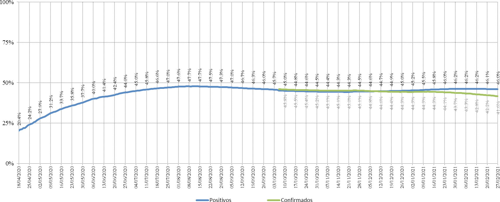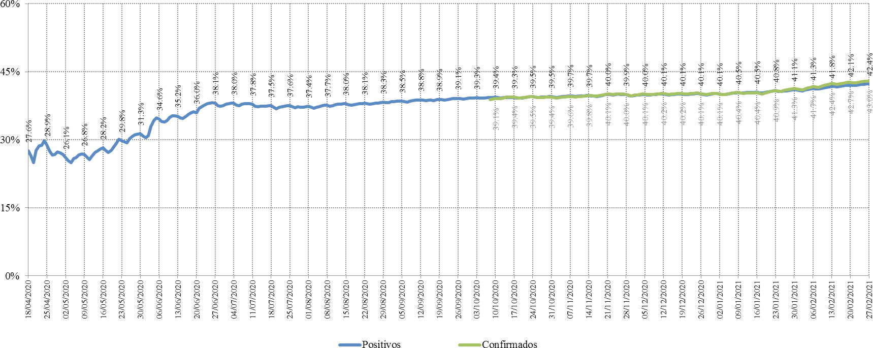 Es por ello que los cambios realizados para ampliar la contabilidad de casos y decesos son referidos solamente como complemento, debido a que su inclusión propicia que la positividad reportada se afecte por sesgos provocados por el patrón de acopio de datos.
