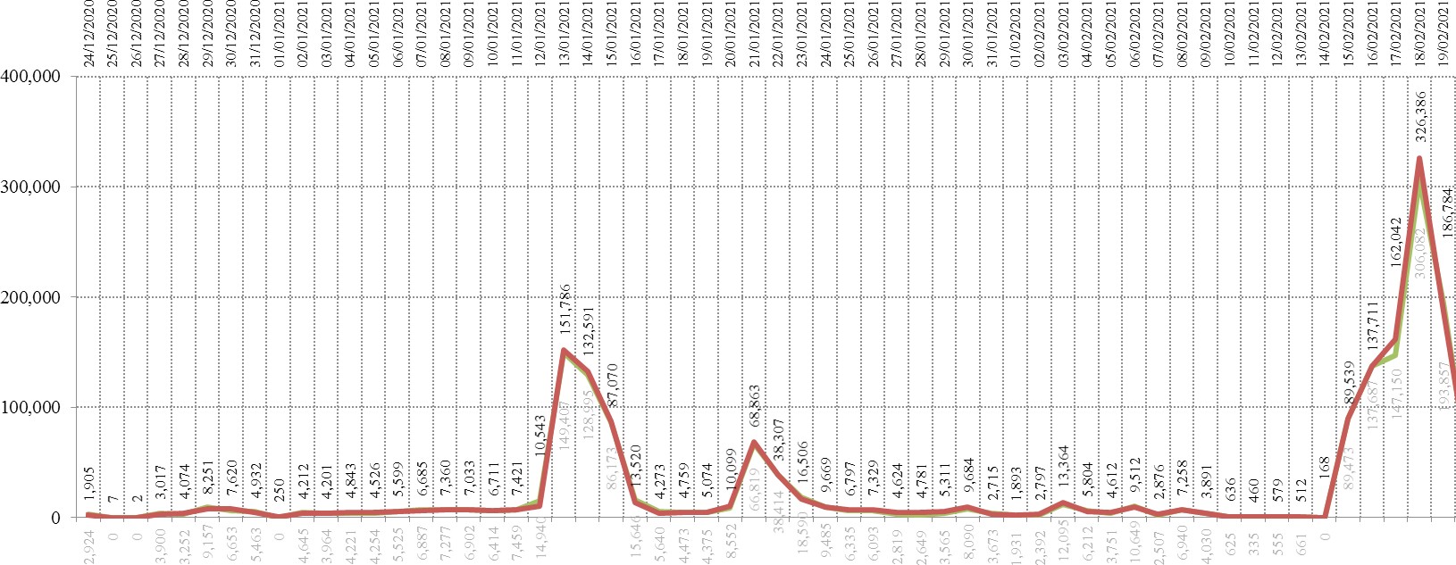 Pero a ello habría que sumar la falta de transparencia en el reporte de la aplicación de vacunas. Cuando cotejamos lo informado sobre dosis diarias de vacunación al corte del 19 de febrero de este año con lo reportado siete días después, se descubren enormes discrepancias que afectan a más de cinco por ciento de los casos y que no siempre corresponden a una esperable acumulación de re- portes que invariablemente elevaría las cifras, sino que en ocasiones repercute en reducciones en el número de dosis aplicadas en un día o en la aparición de casos de vacunación en días en que se anunció que no se realizarían estas actividades (gráfico 21). Aún con los demás más recientes, no se observa un crecimiento estable de la vacunación diaria nie l logro de las metas autoimpuestas por las autoridades federales del país con miras a cubrir la vacunación total de adultos mayores para abril de este año y alcanzar la vacunación de toda la población de 16 y más años de edad para cuando finalice el primer trimestre de 2022.
