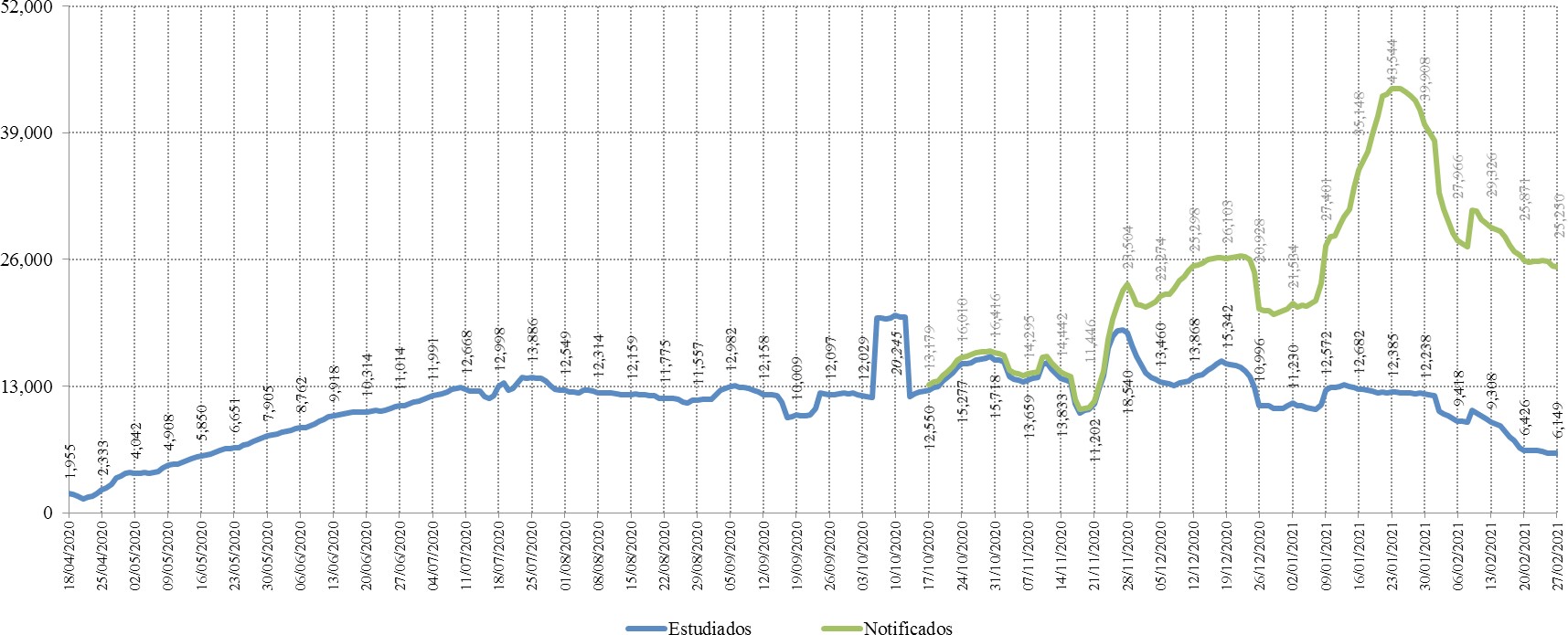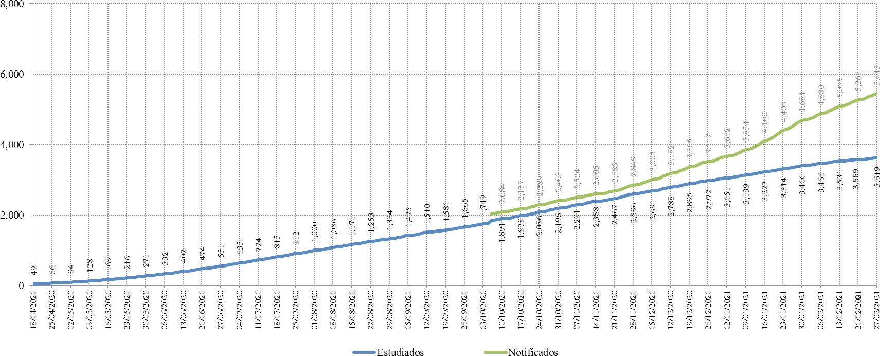 Este comportamiento relativamente estable de los casos estudiados en laboratorio puede corroborarse cuando se ve la curva del acumulado de casos (gráfico 2), donde la pendiente ascendente para los probados por PCR es constante, mientras el total de casos notificados y sometidos a algún proceso de corroboración presenta un incremento en su pendiente a medida que pasa el tiempo.