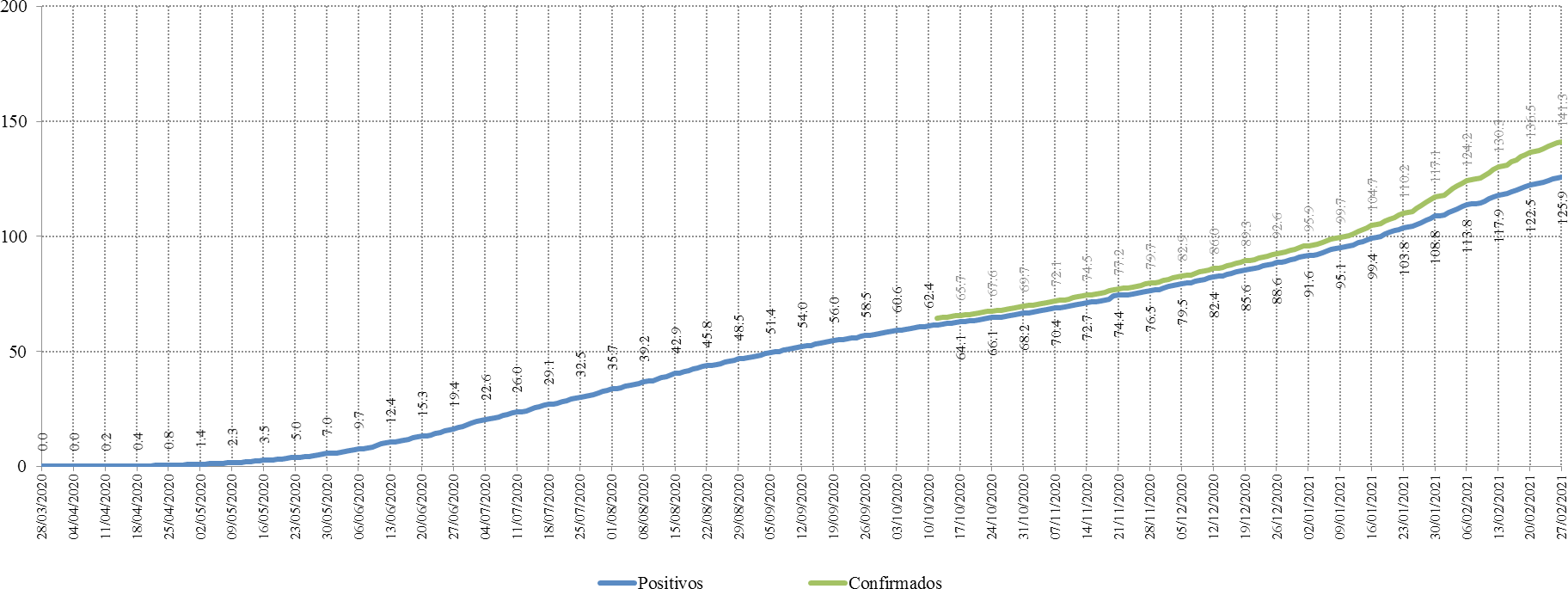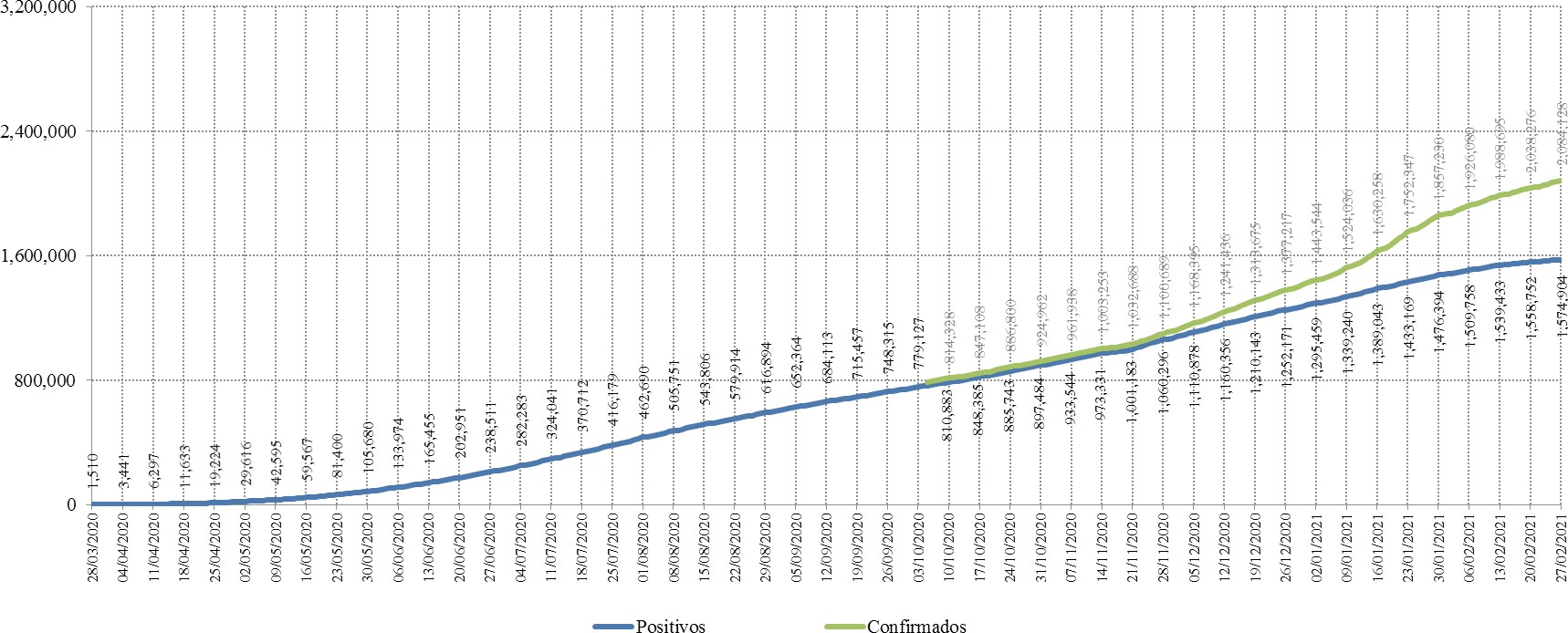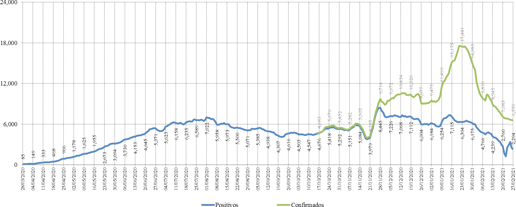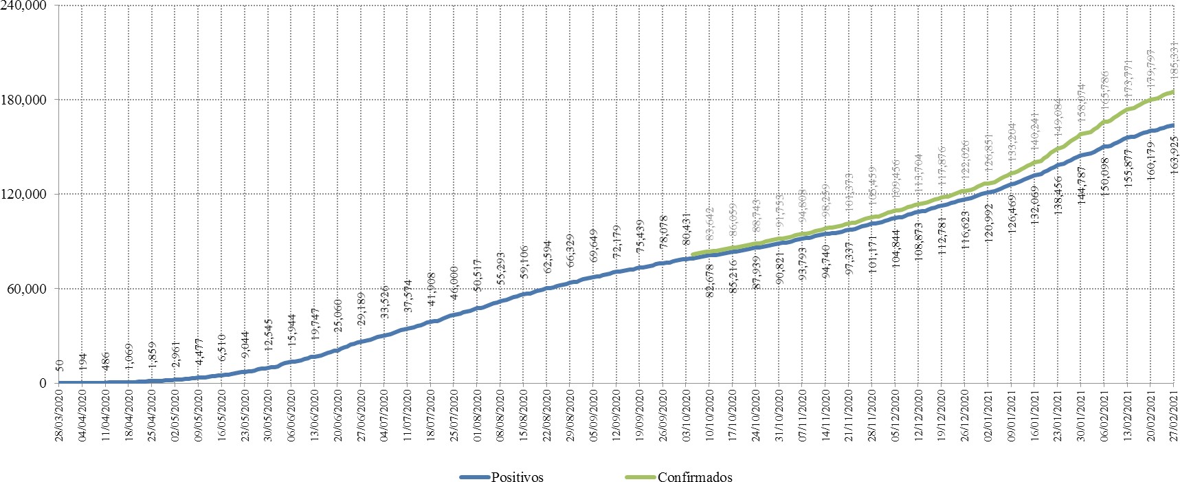 Al cierre del primer año de la pandemia en nuestro país se habría llegado a 164 mil decesos de positivos por prueba de laboratorio y poco más de 185 mil confirmados de contagio de COVID-19 (gráfico 8).