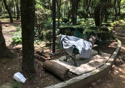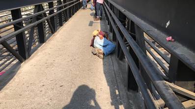 Para la población en situación de calle, seguir las instrucciones para la con- tención y combate a la epidemia ha sido complicado por su necesidad de estar y transitar en lugares concurridos y por la imposibilidad de quedarse en casa y exacerbar las medidas de higiene. La población en situación de calle no podía quedarse en casa porque precisamente su característica principal es la de carecer de una casa donde resguardarse. Y dado que en los primeros meses cuando el semáforo de riesgo epidemiológico estaba en color rojo, los habitantes de la calle cobraron visibilidad y su presencia en el espacio público se hizo más evidente: ellos sí estaban en las calles, en las fuentes, en las plazas, en los puentes, cerca de los pocos lugares concurridos como las inmediaciones de hospitales públicos (figura 3), e incluso empezaron a ser vistos en lugares en donde antes no se veían (figuras 4 y 5).