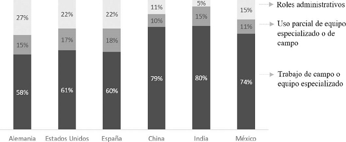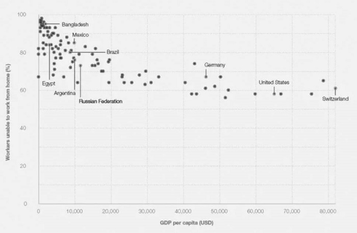 Antes de la pandemia, en la región sólo el 3% de la población tenía condiciones de teletrabajo. Sin embargo, en el periodo de cierres totales a nivel mundial este porcentaje se incrementó a un rango del 20 al 30% de los trabajadores (Naciones Unidas, 2021). Esta proporción es coincidente con las estimaciones del Foro Económico Mundial, en las que comparan el PIB per cápita de los países con las actividades de sus trabajadores, y concluyen que alrededor del 60% de los trabajadores en países de altos ingresos no puede trabajar completamente de manera remota, mientras que esta cifra se incrementa a 80 a 90% para países en desarrollo como los que se encuentran en América Latina (Foro Económico Mundial, 2020).