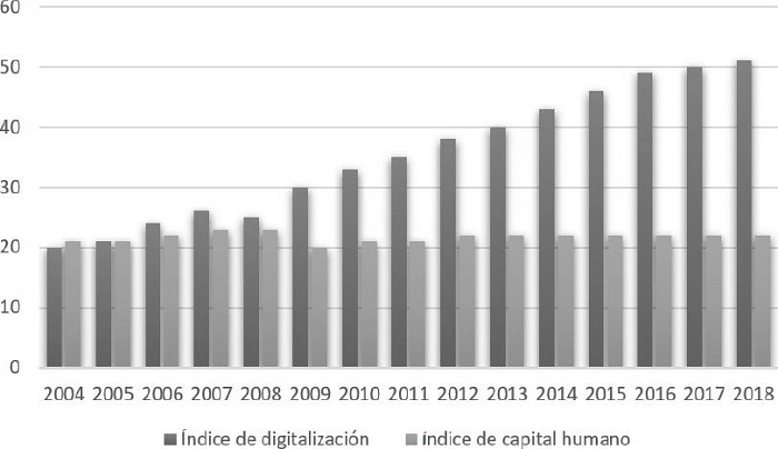 Asimismo, se estima que tan sólo el 40% de las empresas en la región tiene clara una estrategia digital (IDC, 2021b). El resto se ha rezagado con operaciones aparentemente estables que se han vuelto obsoletas frente a las recientes interrupciones repentinas. Todo esto crea desafíos significativos en su viaje de digitalización. Por otra parte, si bien la digitalización puede tener aristas al considerar su avance, parece favorable si se compara con la formación de capital humano necesario para una transición propicia al trabajo digital, por lo que es indispensable que se avance en mejorar el capital humano en diferentes sentidos que incluyan la alfabetización digital.