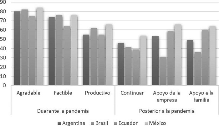 En relación con la expectativa que se genera respecto al futuro del teletrabajo, se denota una menor expectativa relacionada con la opinión que se dio durante la pandemia, de acuerdo con la encuesta regional elaborada por IAE Business School para el año 2000, es posible denotar la aceptación que se dio en los participantes del teletrabajo en los cuatros países listados en la Figura 3; el nivel en promedio fue arriba del 80%, una cifra alta que estuvo inmersa en la aceptación de una situación emergente, en cuanto a la factibilidad que establece la pertinencia de que la actividad se pueda ajustar al teletrabajo, en promedio, más del 72% así lo consideró. Una reducción relevante se da en la percepción respecto al impacto del teletrabajo en los niveles de producción con un promedio ligeramente por debajo del 60%, que se podría interpretar como satisfactorio considerando de igual forma la emergencia sanitaria. En cuanto al futuro, una vez superada o controlada la pandemia, el escenario parece ser menos prometedor que los resultados anteriores, ya que tan sólo un 45% en promedio estaría dispuesto a seguir laborando en las mismas condiciones que durante la pandemia, situación que mejora si la empresa está dispuesta a ofrecer facilidades, el acompañamiento y la capacitación requerida para desarrollar la actividad; en promedio, poco más del 52% estaría dispuesto a continuar con el teletrabajo. Si se cuenta con el apoyo y colaboración de la familia, la cifra de trabajadores dispuestos a continuar es similar a la anterior.