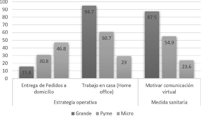 Por otro lado, tenemos la lentitud en la adopción de tecnologías a nivel empresa, ya sea porque a nivel gerencial aún se tiene miedo de implementar este tipo de productos o porque el costo es demasiado elevado. Si nos enfocamos a las acciones operativas de la empresa, durante el confinamiento total por el Covid (mediados del año 2020), el 94.7% de las grandes empresas pudo implementar el trabajo en casa, seguido de un 60.7% de las pequeñas y medianas empresas (pymes) y un 29.0% por parte de las microempresas, situación que se invierte cuando se trata de entrega de pedidos a domicilio donde el 46.8% de las microempresas la instrumentó, seguida de las pymes con un 30.8% y las grandes empresas con sólo un 15.8%, lo que da una idea de las operaciones que se realizan en cada clasificación. Por otra parte, un dato que también arroja evidencias sobre las limitantes en el uso de las tecnologías y su viabilidad para utilizarlas es el uso de la comunicación virtual como una medida sanitaria; en el caso de las grandes empresas el 87.5% motivó el uso de la comunicación virtual con dicho propósito, mientras que las pymes lo hicieron en un 45.9% y las micro en un 26.6%, como se aprecia en la Figura 5 (ECOVID-ML, 2020; ENDUTIH, 2021).