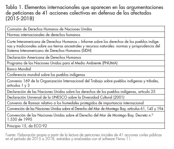 Aunque es menos probable que los procesos a través de organismos internacionales de derechos humanos produzcan éxitos institucionales concretos, en el sentido de alterar el comportamiento de las instituciones de enforcement nacionales, es posible observar claramente el proceso que Risse et al. (2013) llamaron «socialización», definido como un proceso de cambio real del nivel local por los estándares del nivel internacional. La socialización podría ser de tres tipos: a) adaptación y negociación estratégica; b) concienciación moral, argumentación, persuasión, y c) institucionalización y habituación. Ello se puede ver analizando el contenido argumentativo de 41 acciones colectivas interpuestas solo en este caso contra empresas causantes del crimen ambiental, donde se observa reiteradamente el uso de diversos argumentos legales derivados de tratados y recomendaciones internacionales (véase tabla1).
