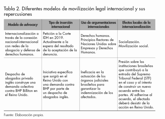 En este artículo se ha analizado el proceso de internacionalización de la movilización legal del desastre minero ocurrido en 2015 en la ciudad de Mariana, en la cuenca del río Doce y en la costa de la región sureste de Brasil. El objetivo ha sido comprender la dinámica que involucró la activación de diferentes escalas de justicia y los efectos que generó su internacionalización en el funcionamiento de las instituciones de justicia a nivel nacional. Así, se observan dos patrones distintos de movilización legal transnacional: uno a través de las tradicionales redes de defensa de los derechos humanos y el otro, nuevo, que ha sido impulsado por un despacho internacional especializado en la «financiación alternativa de litigios» (ALF, por sus siglas en inglés). El primero se basa en el modelo tradicional de conexión de actores en un campo de acción colectiva, en este caso por los derechos humanos, y ha producido hasta ahora efectos muy modestos. El segundo, novedoso y con características diferentes basadas en la ALF, produce un sentido inverso de movilización, que va del exterior al interior del país, para luego volver a salir, alterando los esquemas analíticos establecidos.