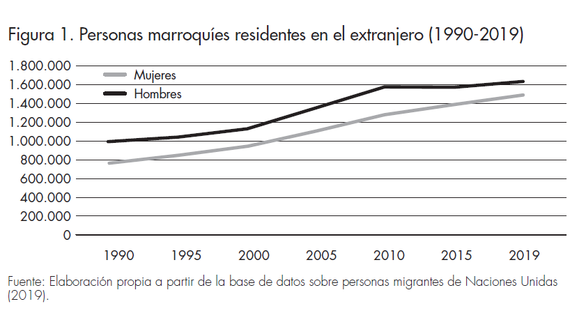Por otro lado, sobre la relocalización industrial, observamos cómo esta actúa como polo de atracción de migrantes provenientes del propio país, pero también y al mismo tiempo genera frustración, actuando como trampolín para la migración internacional. Tanto las migraciones que se producen al interior del país como las que van al extranjero tienen una dimensión de género (Osella y Osella, 2000; Broughton, 2008; Choi, 2018). Tal como muestra la figura 1, la cifra absoluta de marroquíes que residen fuera de su país no ha dejado de aumentar desde el año 1990 y, aunque en los últimos años se ha reducido un poco la diferencia, las mujeres siguen migrando menos.