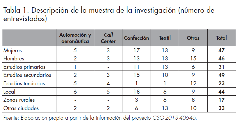 El estudio consiste en un examen analítico-interpretativo a partir de la realización de entrevistas en profundidad a trabajadores y trabajadoras del sector industrial, llevadas a cabo en cuatro oleadas de trabajo de campo entre los años 2014 y 2017. Esta técnica de recogida de información, apoyada en un guion de preguntas abiertas, fue implementada en diversas ciudades de la región de Casablanca. El principal idioma de las entrevistas fue el däriya (árabe magrebí), por lo que se acudió a la figura de ayudantes lingüísticos, lo que supuso una dificultad añadida a la complejidad del trabajo de campo. La técnica utilizada para contactar con las personas entrevistadas fue el llamado muestreo por «bola de nieve», ya que se trata de poblaciones difícilmente accesibles (Atkinson y Flint, 2001). Para la selección de informantes se recurrió a los criterios de muestreo estructural y saturación teórica, los cuales facilitan un desarrollo conjunto de los procesos de obtención y análisis de la información. En las primeras oleadas de trabajo de campo el muestreo fue abierto, en búsqueda de situaciones que aportaran información relevante sobre el objeto de estudio. Paulatinamente, la investigación fue orientándose hacia determinados informantes que proporcionaran una mayor variabilidad de categorías: género, edad, nivel educativo, región de procedencia, categoría ocupacional y rama industrial (véase la tabla 1). Cuando se alcanzó la saturación teórica de los discursos, se dieron por finalizadas las fases de muestreo y trabajo de campo con un total de 93 entrevistas a trabajadores de la industria de exportación en los siguientes sectores: automoción y aeronáutica, call centers, confección, textil y otros, lo que es un indicador de la gran diversidad muestral.
