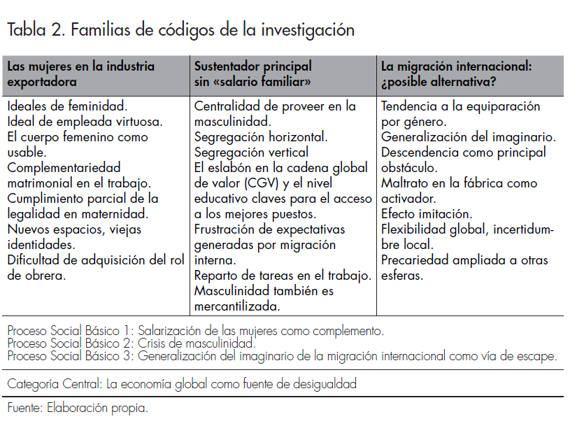 El procedimiento analítico utilizado fue la teoría fundamentada, por ser un enfoque idóneo para investigar desde la interseccionalidad, ya que su método de comparación constante entre categorías nos permite dilucidar las relaciones entre ellas (Glaser, 1992). Siguiendo esta metodología de análisis (Charmaz, 2014), se realizó un proceso trifásico de codificación asistido por el software Atlas.ti 8, que permitió reconocer la propia estructura de los datos, así como la teoría emergente. Para ello se inició, en primer lugar, un proceso de codificación abierta donde, a partir de la comparación constante de los «incidentes» hallados en los relatos de los trabajadores, se encontraron regularidades y singularidades. En segundo lugar, se llevó a cabo la codificación selectiva en la que, una vez identificado el código «La economía global como fuente de desigualdad» como categoría central, la explicación se centró en aquellas dimensiones que se relacionan de manera significativa con dicha categoría. Tras detectar la importancia del género, estado civil y condición migrante en el análisis, se intersectaron dichas categorías. El estado civil emerge como dimensión explicativa para entender la relación entre género y esfera laboral, al brindar la información sobre el núcleo y la organización familiar. La inclusión de la condición de migrante como categoría de análisis permite profundizar en el conocimiento de la diversidad interna de la mano de obra a través del estudio de su composición atendiendo al origen de la misma. Finalmente, la codificación teórica posibilitó introducir conceptos de mayor nivel de abstracción a través de la emergencia de tres familias de códigos: a) el rol de las mujeres en la industria de exportación; b) la crisis de masculinidad, y c) la migración como posible vía de escape al malestar emergente (véase la tabla 2).