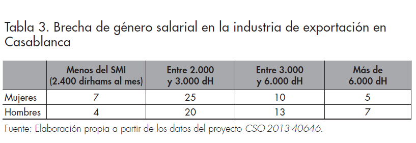 Dentro de los sectores con mayor mano de obra masculina en la industria de exportación destacan el calzado y la aeronáutica. En este último, además, se observa claramente la segregación vertical: los puestos de ingeniero son ocupados mayoritariamente por hombres mientras que el montaje de piezas está altamente feminizado. Entre los más feminizados, textil y confección, aunque la presencia masculina ha ido creciendo en los últimos años, como ha pasado en otros contextos (ibídem). Este reparto de la mano de obra por género según sector y puesto deriva claramente en una diferencia en los ingresos percibidos (véase la tabla 3). El salario mínimo interprofesional (SMI) marroquí es de 13,46 dírhams (dH) por hora desde 2015, lo que teniendo en cuenta las horas trabajadas, rondaría unos 2.400 dírhams al mes. Según Setem (Sales i Campos y Piñeíro Orge, 2012), la cesta básica, es decir, el salario necesario para cubrir las necesidades de una familia compuesta por dos personas adultas y dos menores, es de 639€/mes, el equivalente a 7.157 dírhams/mes. Solo 12 personas de las entrevistadas tendrían acceso a ella.