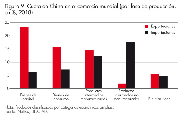 China ha dejado de estar en la periferia y se ha convertido en el centro de la cadena global de valor, especialmente en términos de bienes intermedios. Si en 2003 el 8% de las exportaciones mundiales de productos manufacturados procedían de China, en 2018 este porcentaje había aumentado hasta un 19%. Asimismo, el dominio de China en sectores tales como la maquinaria de oficina, el mobiliario y las prendas de ropa es aún mayor, con un 50%, 60% y 40% de la cuota de mercado mundial, respectivamente. Además de ganar cuota de mercado a nivel de exportación bruta, los productos intermedios chinos se utilizan en la cadena global de valor en mayor medida que en el pasado. El dato más importante es que sus exportaciones de productos intermedios utilizados por el resto del mundo como insumos para la exportación han aumentado considerablemente desde 2003, pasando del 24% al 32% de las exportaciones brutas de China. La figura 9 desglosa la fase de producción china de exportaciones e importaciones como porcentaje del conjunto mundial. La cuota de exportación mundial de China es mucho mayor para todas las categorías, excepto para los productos intermedios no manufacturados, en su mayoría materias primas. Como resultado, China ha logrado una cuota de mercado cada vez mayor y, en la actualidad, dominante en la exportación mundial de productos intermedios manufacturados.