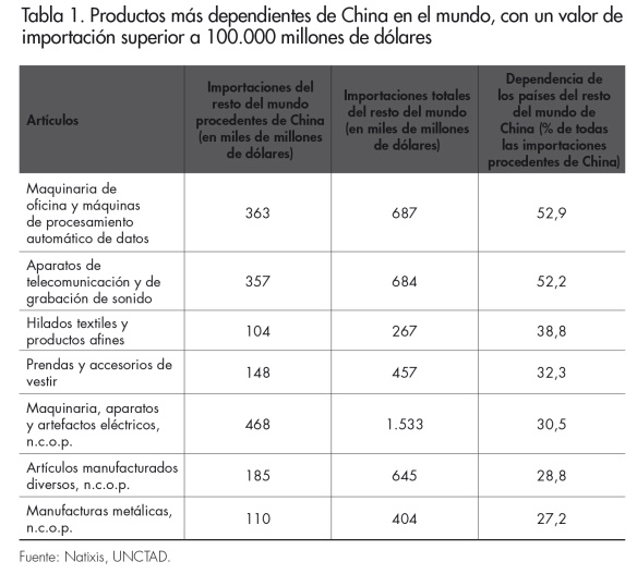 La situación en el resto del mundo no difiere demasiado de la de Europa, ya que China domina algunos mercados de exportación en más del 50%, como los de maquinaria de oficina, equipos de telecomunicaciones, productos textiles y maquinaria eléctrica, según un informe de la Conferencia de las Naciones Unidas sobre Comercio y Desarrollo (UNCTAD, por sus siglas en inglés) basado en productos de dos dígitos de la Clasificación uniforme para el comercio internacional (CUCI) (UNCTAD, s.f.) (véase la tabla 1).