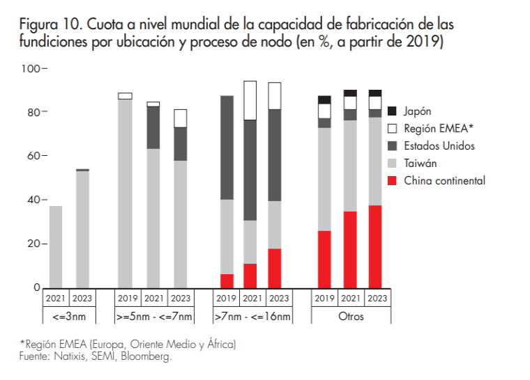 En definitiva, se podría argumentar que la completa resiliencia de la cadena de suministro es más una aspiración que un objetivo alcanzable, ya que la dependencia excesiva de una geografía específica no es infrecuente y está relacionada con muchos factores diferentes, sobre todo teniendo en cuenta que aumentar la resiliencia de la cadena de suministro suele implicar costes elevados. Sin embargo, esta dependencia es cada vez más arriesgada, hasta el punto de alterar el equilibrio económico entre resiliencia y eficiencia, ya que las tensiones geopolíticas y los acontecimientos de gran alcance imprevistos (como la COVID-19) pueden alterar e incrementar las vulnerabilidades de los participantes en las cadenas globales de valor. La centralidad de China en la cadena global de valor ha desencadenado acciones de otros actores para reducir su dependencia respecto a este país. En particular, la aparición de una rivalidad cada vez más dura entre Estados Unidos y China ha empujado a las empresas hacia la diversificación. La guerra en Ucrania y las sanciones conexas a China también han sido decisivas para influir en la opinión de las empresas sobre las ventajas de la diversificación, dada la elevada concentración de semiconductores avanzados en Taiwán, lo que sigue siendo un riesgo clave para el futuro.