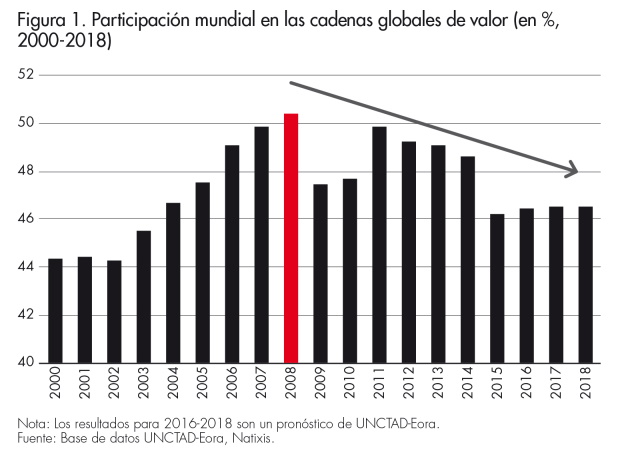 Base de datos UNCTAD-Eora, Natixis.La tendencia preocupante respecto a la reducción del tamaño de las cadenas de valor no debería sorprender, ya que se sustenta en el debilitamiento de la OMC como garante del sistema mundial del comercio multilateral y como principal actor detrás de la liberalización del comercio a escala global. Su órgano de apelación, que arbitra las disputas, ha funcionado de manera deficiente, sobre todo desde que la Administración Trump bloqueó la renovación de sus jueces. Además, la mayor heterogeneidad de sus miembros desde la adhesión de China –incluidas otras economías emergentes y países del antiguo bloque soviético– ha dificultado cada vez más el avance de nuevas medidas de liberalización y la resolución de disputas comerciales. En resumen, tanto el profundo desdén del presidente Trump por el multilateralismo, como el modelo estatalista de China, han sido simplemente incompatibles con un sistema de comercio mundial abierto regido por el multilateralismo y, más concretamente, por la OMC. Asimismo, el creciente papel de las prácticas ajenas al mercado en China, basadas en su modelo económico dirigido por el Estado, ha sido otro gran desafío para que el sistema de comercio mundial siga funcionando.
