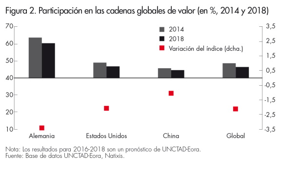 La desglobalización no es un concepto nuevo, sino más bien una megatendencia que ya se había observado en el pasado, por ejemplo, justo antes de la Primera Guerra Mundial. Más recientemente, las primeras señales de desglobalización, que se mide en función del tamaño de las cadenas globales de valor –en términos de menor participación de distintos países en estas–, empezaron a aparecer tras el estallido de la crisis financiera mundial en 2007-2008. Si se miden las cadenas globales de valor como la cantidad de bienes intermedios importados para su reexportación o exportados a otros países para que los reexporten, se observa que estas están en declive neto desde 2008 (véase la figura 1). Un descenso que ha sido mucho mayor en Europa (representada por Alemania en la figura 2) –seguida de Estados Unidos– que en China. Aunque la UE sigue siendo la región del mundo más integrada en dichas cadenas, el descenso de dicha participación es también el más rápido y está en consonancia con la disminución de la cuota de la UE en las exportaciones de manufacturas a escala mundial. Una de las muchas fuerzas que impulsan la desglobalización es la competencia estratégica Estados Unidos-China; aunque existen otras como el populismo, que insta a los gobiernos a relocalizar la producción, o las consideraciones urgentes sobre el cambio climático, que exigen cadenas de suministro más cortas. La COVID-19 ha sido otro factor muy importante que ha contribuido a la desglobalización.