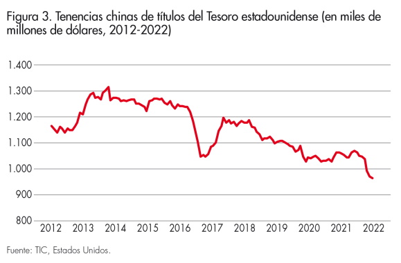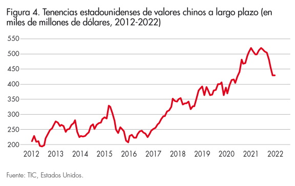 Las fuerzas de desacoplamiento son mucho menos evidentes en el caso de los flujos financieros, aunque siguen siendo visibles. Al respecto, la invasión de Ucrania por parte de Rusia y las sanciones impuestas a esta última, con posibles implicaciones para China en términos de sanciones secundarias, constituyen un claro punto de inflexión. De hecho, el Congreso de Estados Unidos ha pedido a los fondos públicos de pensiones y a las universidades que desinviertan sus participaciones en determinadas clases de activos, principalmente los relacionados con Xinjiang[1] o con empresas chinas vinculadas al sector militar. Al mismo tiempo, las tenencias chinas de títulos del Tesoro estadounidense se han desacelerado con bastante rapidez desde el máximo alcanzado en 2013, pero la realidad es que China posee tales títulos a través de intermediarios, lo que significa que sus tenencias totales son muy difíciles de rastrear (véase la figura 3). Por último, las tenencias estadounidenses de renta fija y variable china se han ido reduciendo, especialmente desde la invasión rusa de Ucrania y las sanciones occidentales que la siguieron (véase la figura 4).