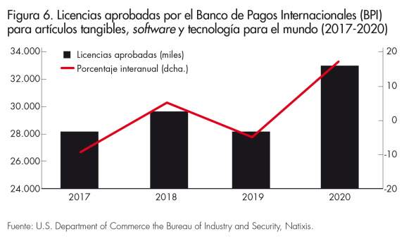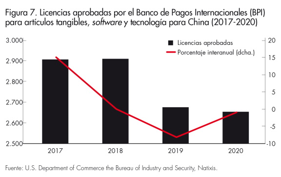Entre los muchos aspectos de la desvinculación entre China y Estados Unidos, el más importante es probablemente el de la tecnología, que se había expandido globalmente y, por lo tanto, beneficiado tanto de las economías de escala como de las externalidades de red. Sin embargo, esta expansión se ha empezado a ver frenada por limitaciones políticas. Empezando por China, desde la expansión de Internet, el país ha intensificado las medidas para controlar la red continental y la nube, es decir, el flujo de información. Pero más allá de las redes sociales y la nube, no se ha producido un verdadero desacoplamiento en hardware y otro tipo de tecnologías, ya que el objetivo final de China es seguir su ascenso mediante la adopción de tecnología extranjera. En referencia a Estados Unidos, la Administración Trump se propuso, desde los primeros pasos de la guerra comercial, contener la carrera tecnológica china, a medida que este era cada vez más consciente de la rápida actualización de China en este ámbito y de sus ambiciosos objetivos industriales recogidos en la iniciativa Made in China 2025. En este contexto, la transferencia de tecnología se ha ido restringiendo cada vez más mediante el endurecimiento de los controles a la exportación de los productos tecnológicos de alta gama. Se trata de una herramienta que fue desarrollada por primera vez por Estados Unidos para reforzar su control sobre las transferencias de tecnología al resto del mundo a través de la reducción de las licencias de exportación de productos tecnológicos sensibles (véase la figura 6). Sin embargo, desde el estallido de la guerra comercial, la herramienta se dirige cada vez más hacia China. De hecho, aunque el número de autorizaciones para China seguía manteniéndose elevado en 2018, este se contrajo masivamente tras el inicio de la guerra comercial en ese mismo año (véase la figura 7). A su vez, China ha introducido recientemente licencias de exportación en tecnologías clave como, por ejemplo, la tecnología de drones y la inteligencia artificial (IA).