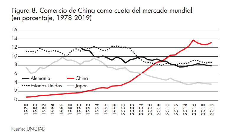 El ascenso del papel de China en la cadena global de valor fue consecuencia de abrir y reformar la economía en 1978 –tras el experimento infructuoso con la política económica de planificación centralizada–, que mejoró significativamente su integración en los mercados internacionales a través del comercio, los flujos de inversión y el intercambio de tecnología. Sin embargo, los sectores abiertos a la inversión siguen siendo limitados y se concentran en la industria manufacturera. Además, en la mayoría de los sectores clave se exige a los inversores extranjeros que establezcan joint ventures con compañías locales para mantener el control, lo que conlleva riesgos de transferencia forzosa de tecnología. Por lo tanto, a pesar de que la apertura de China ha conseguido traer el desarrollo económico del país, el progreso está en gran medida sesgado hacia el comercio, sin cambiar completamente la naturaleza de la competencia en el mercado chino. Debido a la política de liberalización selectiva, el comercio exterior de China ha tenido 42 años de rápido desarrollo, como muestra la figura 8 (la cuota de mercado de China en las exportaciones totales en comparación con Estados Unidos, Alemania y Japón desde 1978 hasta 2018): la proporción de las exportaciones de China en el comercio mundial pasó de aumentar menos del 1% en 1978 hasta el 13% en 2019. Mientras tanto, Estados Unidos, Japón y Alemania han experimentado un descenso en su cuota de mercado, y se han visto superados por China en cuanto a su contribución a las exportaciones mundiales. En otras palabras, China se ha convertido exitosamente a un ritmo asombroso en una parte esencial del comercio internacional, por lo que el mundo es ahora mucho más dependiente de China.