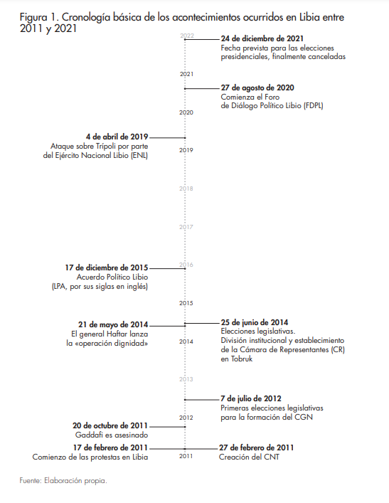 Esta competición por la legitimidad se hizo evidente tras la crisis política iniciada en 2014, cuando la negativa por parte del Consejo General de la Nación (CGN) a reconocer los resultados de las elecciones legislativas de ese año condujo a una duplicidad institucional entre el Gobierno de Salvación Nacional, sustituido por el Gobierno de Acuerdo Nacional (GAN) –bajo el auspicio de Naciones Unidas, tras la aprobación del Acuerdo Político Libio (LPA, por sus siglas en inglés) en 2015, con sede en Trípoli– y la Cámara de Representantes (CR), que se asentó en la Cirenaica (región oriental). El inicio de una campaña militar por parte del general Jalifa Haftar y el autoproclamado Ejército Nacional Libio (ENL) también en 2014, y su control territorial sobre la Cirenaica, apoyado y reconocido por la CR, contribuyó aún más a enmarañar la ya compleja situación del país. Este entramado de alianzas tribales, políticas e institucionales han constituido dos núcleos de poder en torno a las élites y milicias de Misrata (posteriormente presentes en el CGN y en el GAN) y el centro de poder de Zintan (aliado del general Haftar y la CR). Hasta el momento, ninguna de las iniciativas internacionales multilaterales promovidas desde 2015 han logrado acabar con esta bicefalia, generadora de un bloqueo político que quedaría confirmada, una vez más, tras el fracaso de la convocatoria electoral de diciembre de 2021.