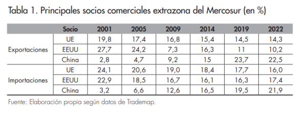Como consecuencia de todo esto, a partir de 2013, el Gobierno brasileño, encabezado entonces por Dilma Rousseff, buscó impulsar la negociación, encontrando no obstante tanto la reticencia de Argentina como el impacto negativo de divergencias intra-UE. Tras el cambio de Gobierno en Argentina, y coincidiendo con el juicio político a Rousseff, la negociación concitó a partir de 2016 mayores consensos intrabloque. Del lado europeo, acordar con Mercosur recobró valor geopolítico y geoeconómico tras la victoria de Trump en Estados Unidos y su contestación del orden internacional liberal, ya que la UE procuró constituirse como el bastión de defensa de un orden comercial basado en reglas (Sanahuja y Rodriguez, 2019; Álvarez y Zelicovich, 2020; Caetano y Pose, 2020; Pose, 2022). Todo esto se daba, además, en un contexto donde la emergencia de China implicaba que, a la histórica lógica triangular de las relaciones UE- Estados Unidos-Mercosur, se sumara un nuevo actor, que progresivamente se convirtió en el primer socio comercial extrazona del bloque sureño, como muestra la tabla 1.