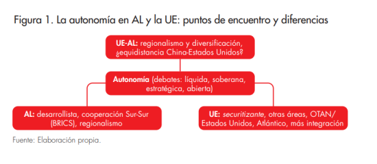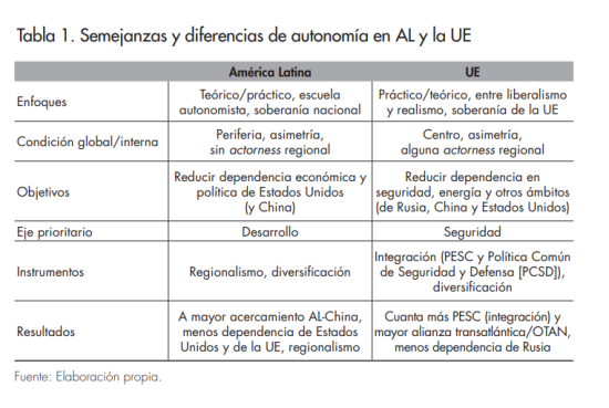 Como resume la tabla 1, AL y la UE coinciden a grandes rasgos en los objetivos de la autonomía y en los instrumentos principales (regionalismo, diversificación). En cuanto a enfoques y tiempos, los debates autonomistas latinoamericanos difieren, pero tienen en común el desarrollo paralelo de debates académicos y políticos sobre el tema. También comparten, a diferentes niveles, un actorness regional relativo o débil igual que la soberanía (colectiva en el caso de la UE y nacional en el latinoamericano) y una cierta asimetría de poder y peso material frente a China y Estados Unidos. Concuerdan también en la dependencia (económica y militar) de Estados Unidos, aunque difieren en cuanto a las relaciones con Rusia o China y también a los retos que implica la autonomía para las dos regiones.
